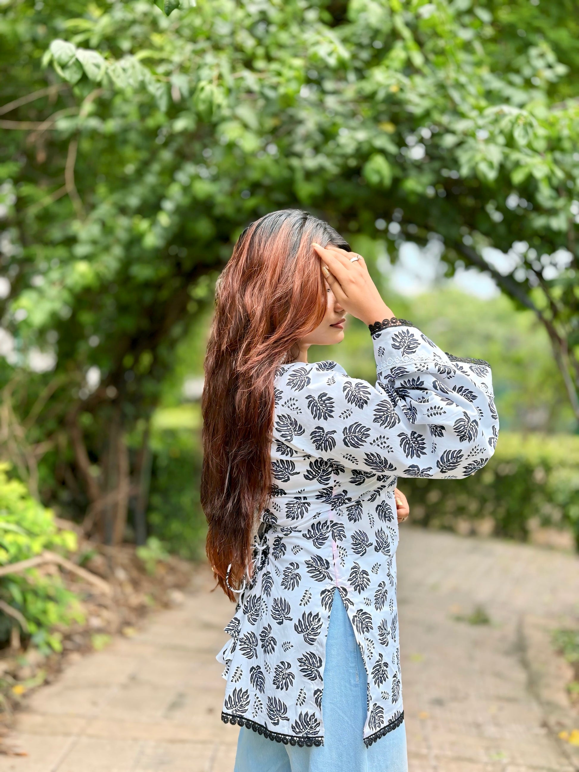 Channel the effortless charm of the ’90s with a fresh, modern twist in our Mishti Corset Back Kurti. Crafted in a breezy white cotton fabric and adorned with elegant black leafy prints, this short kurti is all about chic comfort and feminine flair.🥰